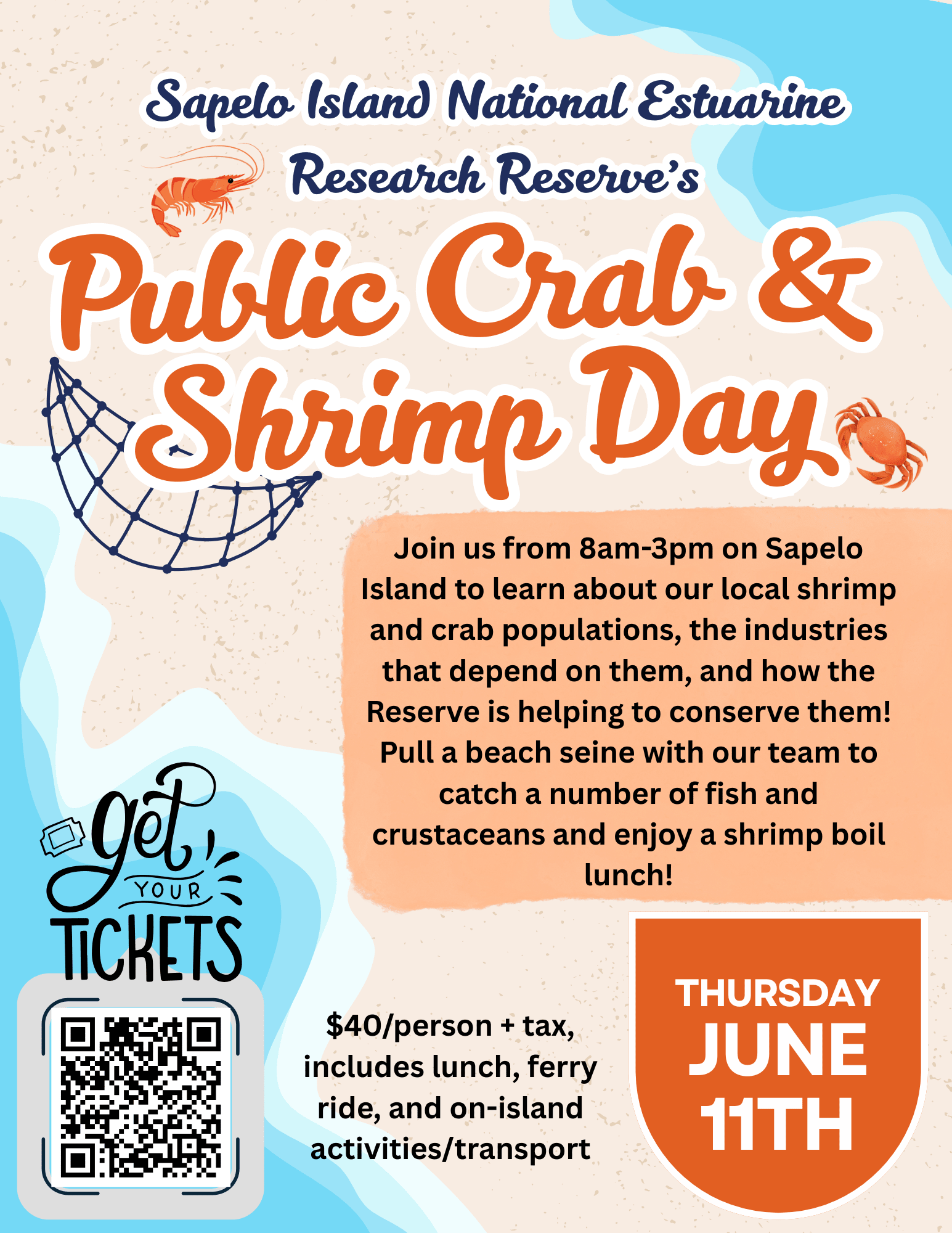 Join us from 8am-3pm on Sapelo Island to learn about our local shrimp and crab populations, the industries that depend on them, and how the Reserve is helping to conserve them! Pull a beach seine with our team to catch a number of fish and crustaceans and enjoy a shrimp boil lunch! $40 per person + tax. Includes: lunch, ferry ride and on-island activities and transport